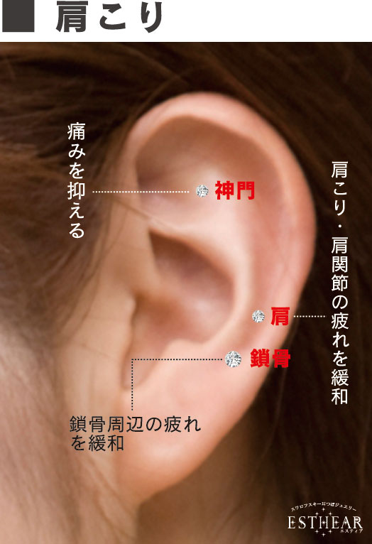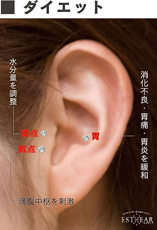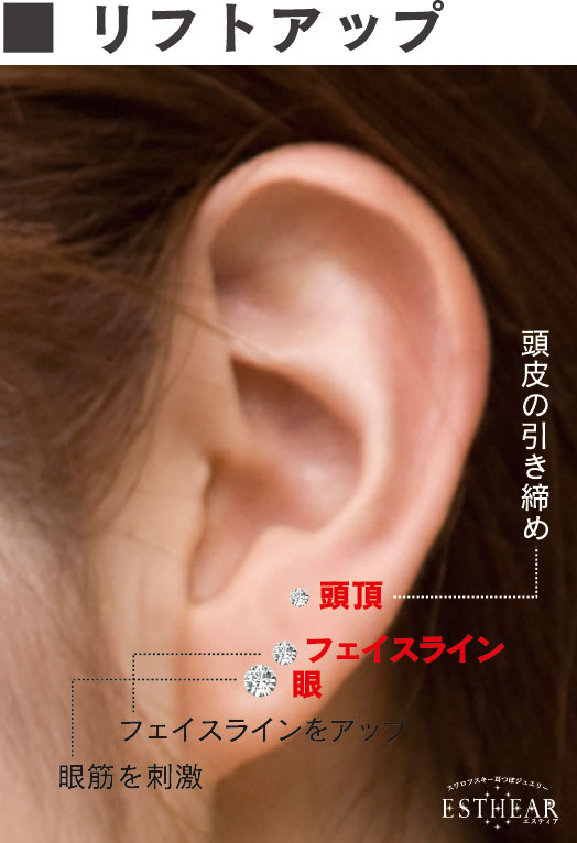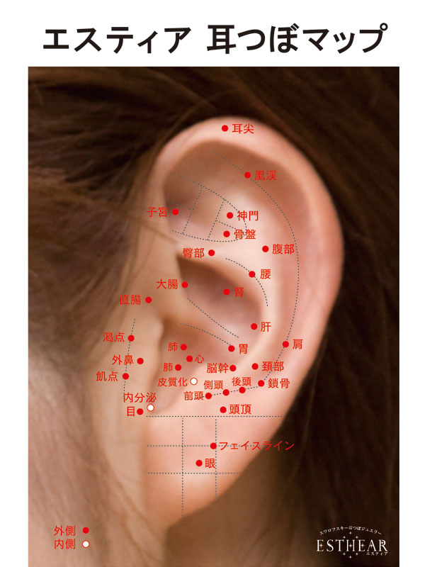 エスティアとは、14面カットで輝き続ける最高級クリスタルガラス「SWAROVSKI (スワロフスキー)」のカラーヒーリングと皮膚刺激による「耳エステ(24金の粒を使用)」を融合させた耳介リフレクソロジーのことで、Esthe(エステ) + Ear (耳) ⇒ ESTHEAR(エスティア)といいます。